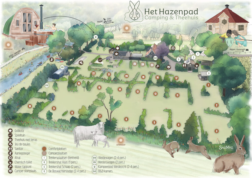 « Nous sommes entrés en contact avec Snibbit par le bouche-à-oreille pour le développement d’un nouveau plan. Notre souhait était de créer un plan qui reflète davantage notre concept et notre expérience : un camping forestier robuste dans la province originelle de Drenthe ! Judith a tout de suite été enthousiaste et est venue rapidement sur place pour voir tout le terrain elle-même et discuter de nos souhaits. Elle s’est ensuite mise au travail rapidement et nous avons reçu entre-temps de chouettes photos de l’avancement. Nous sommes très contents du résultat final ! Judith a l’œil pour le détail. Le plan est magnifiquement conçu, reflète notre identité visuelle et notre expérience, est clair et montre que le camping est entièrement situé dans la forêt. Ainsi, le plaisir des vacances au Boscamping Zwanemeer commence déjà à la maison lors de la réservation de l’emplacement ! » «